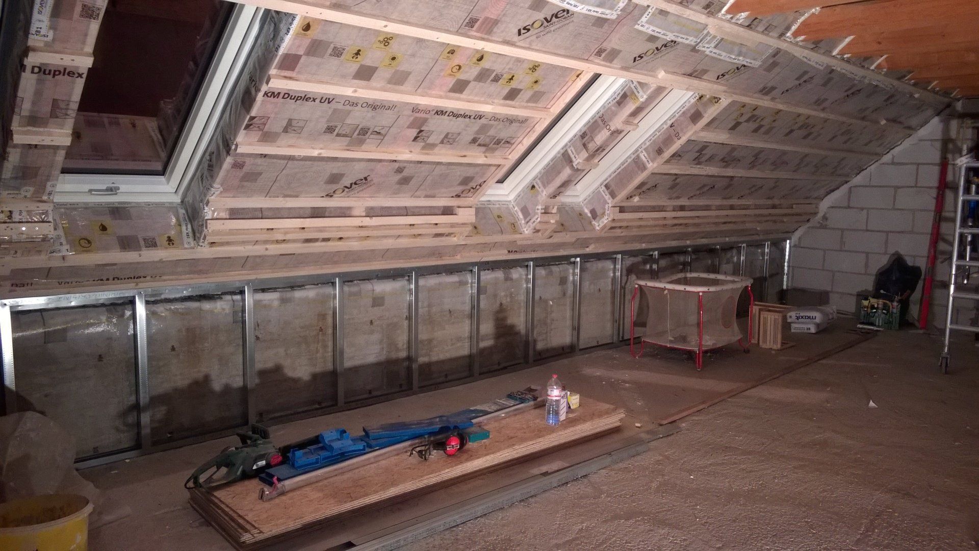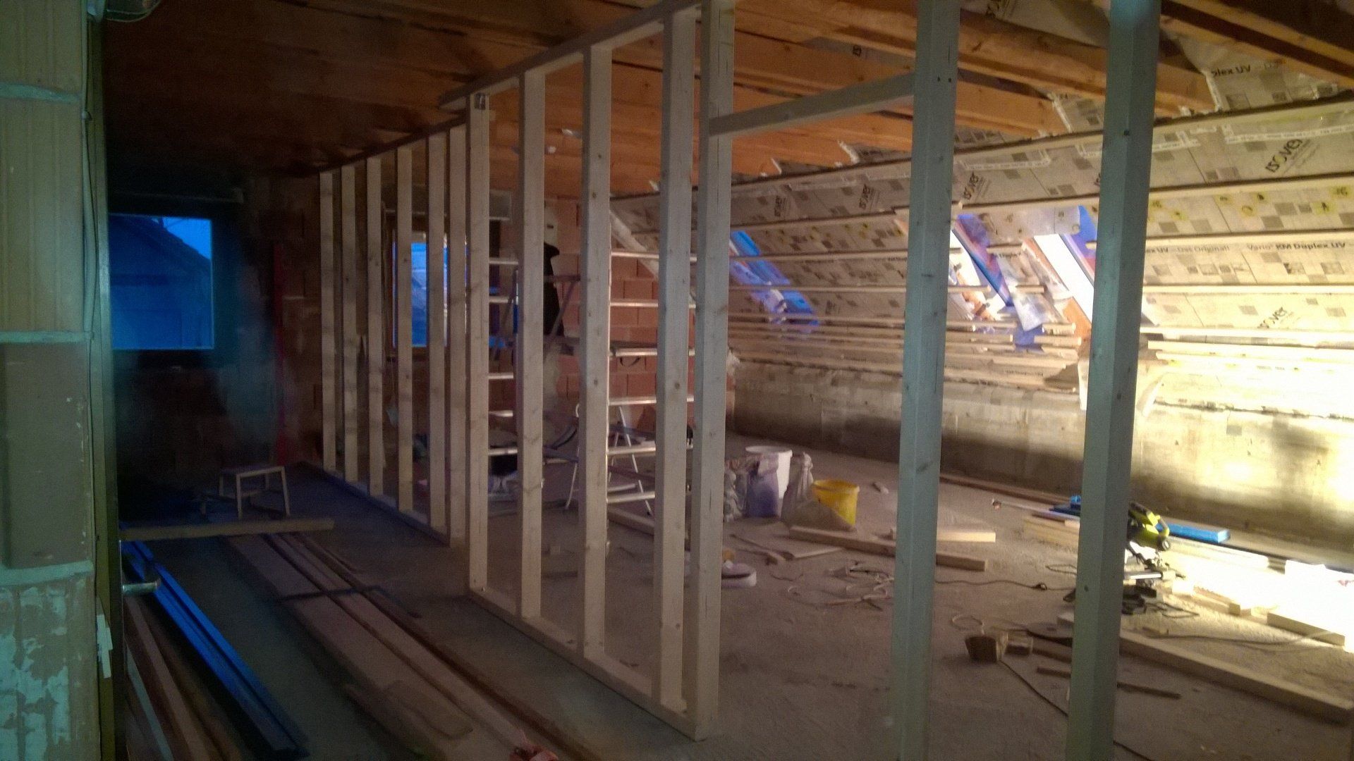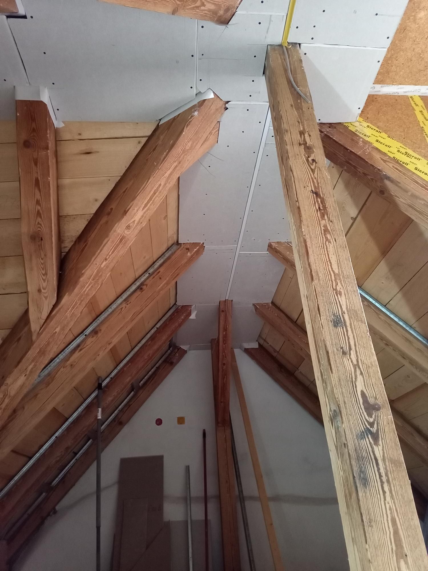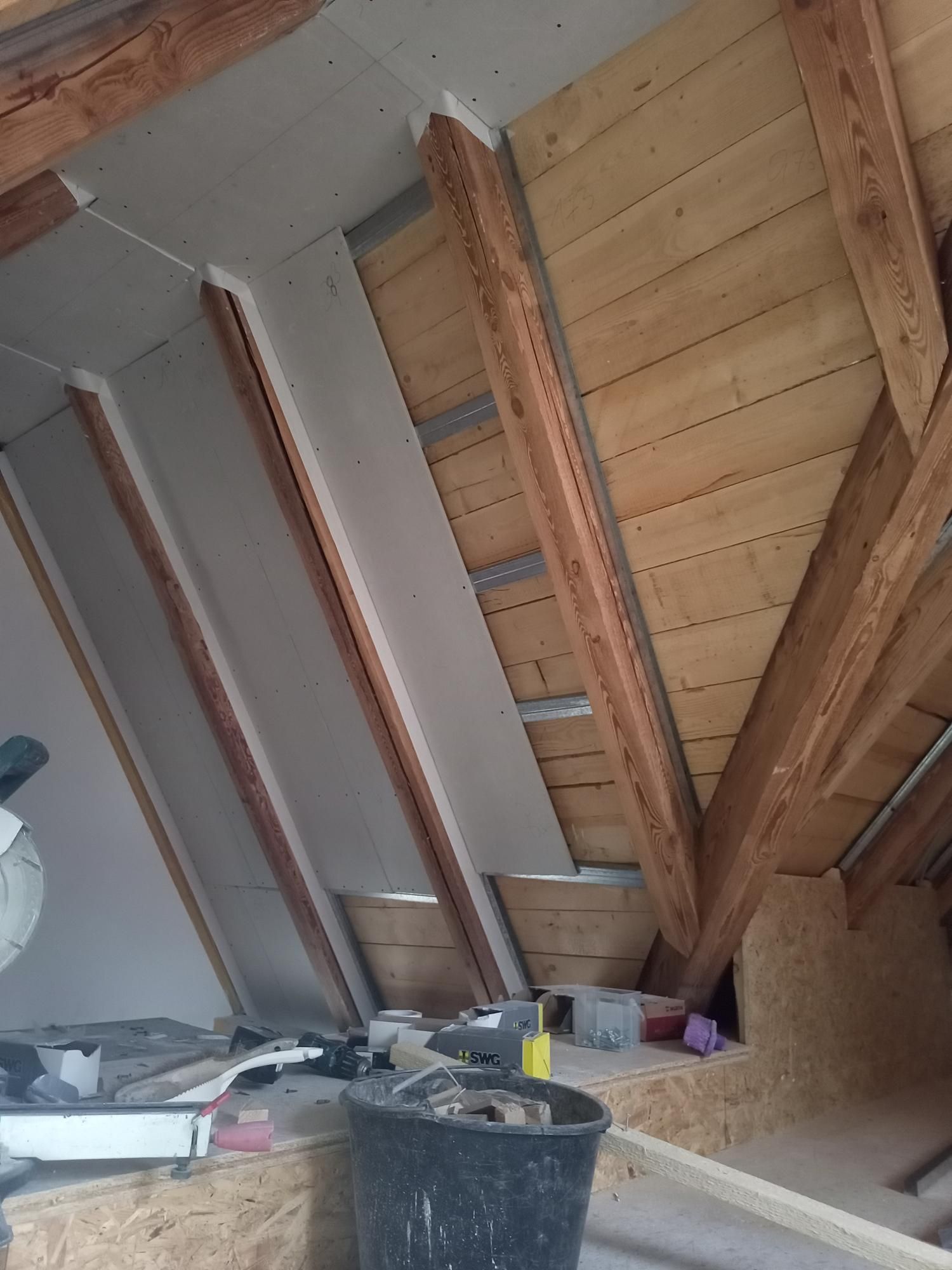 Die Bilder zeigen eine Wand aus Konstruktionsholz, sowie eine Zwischenparrendämmung mit Abstellung und eine Rigipsdecke, die um die Balken eingepasst wurde.